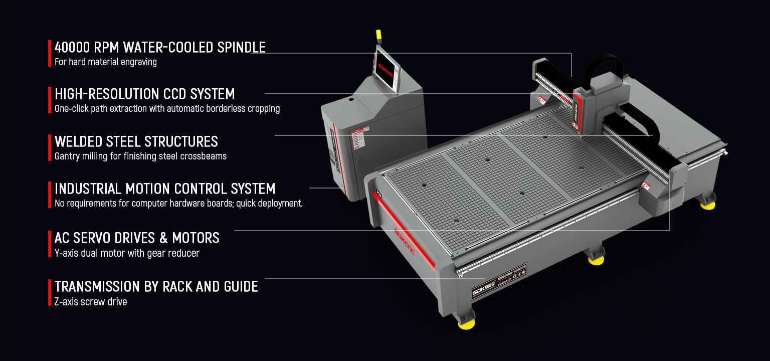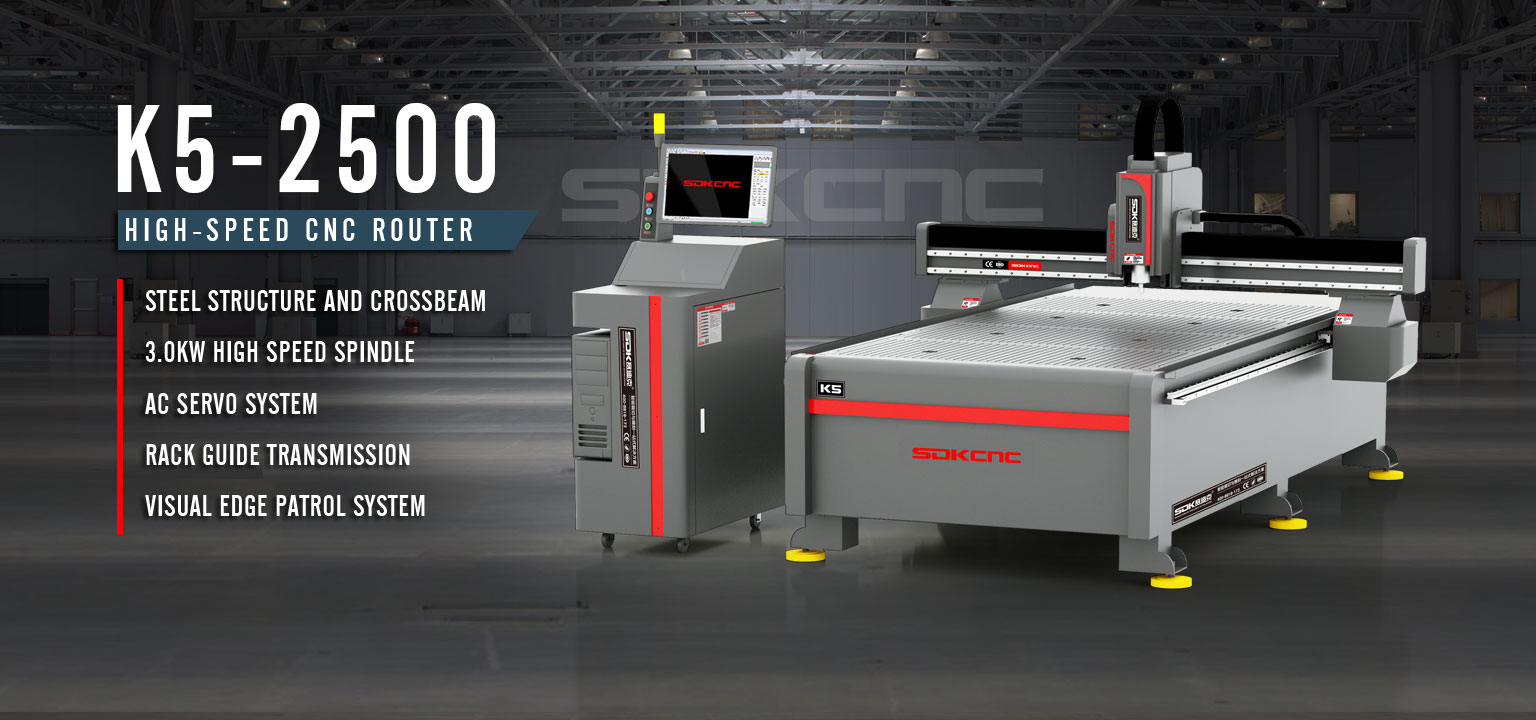 The SDKCNC K5-2500 is a high-speed border-tracing engraving machine designed for hard material cutting and engraving. It features an AC servo drive system with a speed reducer, making it widely suitable for high-speed processing of materials like acrylic, PVC, ABS, and MDF boards. Equipped with a standard CCD system, it is particularly well-suited for the post-processing of complex-shaped workpieces in industries such as UV printing.